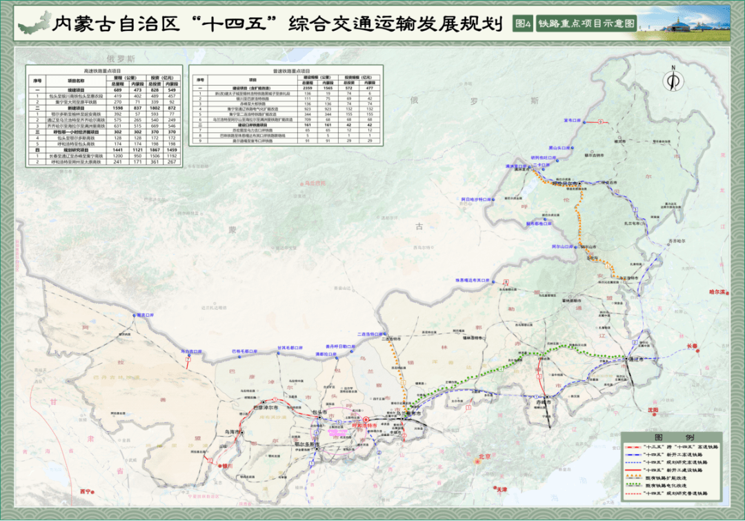 根據(jù)規(guī)劃里的綜合交通網(wǎng)絡(luò)建設(shè)項(xiàng)目表,內(nèi)蒙古十四五期間將推進(jìn)9條高鐵重點(diǎn)項(xiàng)目,總里程4030公里,總投資4855億元。其中:續(xù)建2條,新建3條,呼包鄂一小時(shí)經(jīng)濟(jì)圈2條,規(guī)劃研究2條。