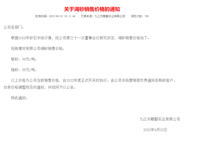三,鄱陽(yáng)湖砂:鄱陽(yáng)湖砂近期銷售進(jìn)展較好,自6月23日公布湖砂價(jià)格以來(lái),采區(qū)船只密集,排號(hào)船只可達(dá)百條,下游需求恢復(fù)期間,采區(qū)價(jià)格未有變動(dòng),目前貿(mào)易商或者代理商在采區(qū)價(jià)格之上浮動(dòng)約為2-4元即可上船。以下是調(diào)價(jià)通知: